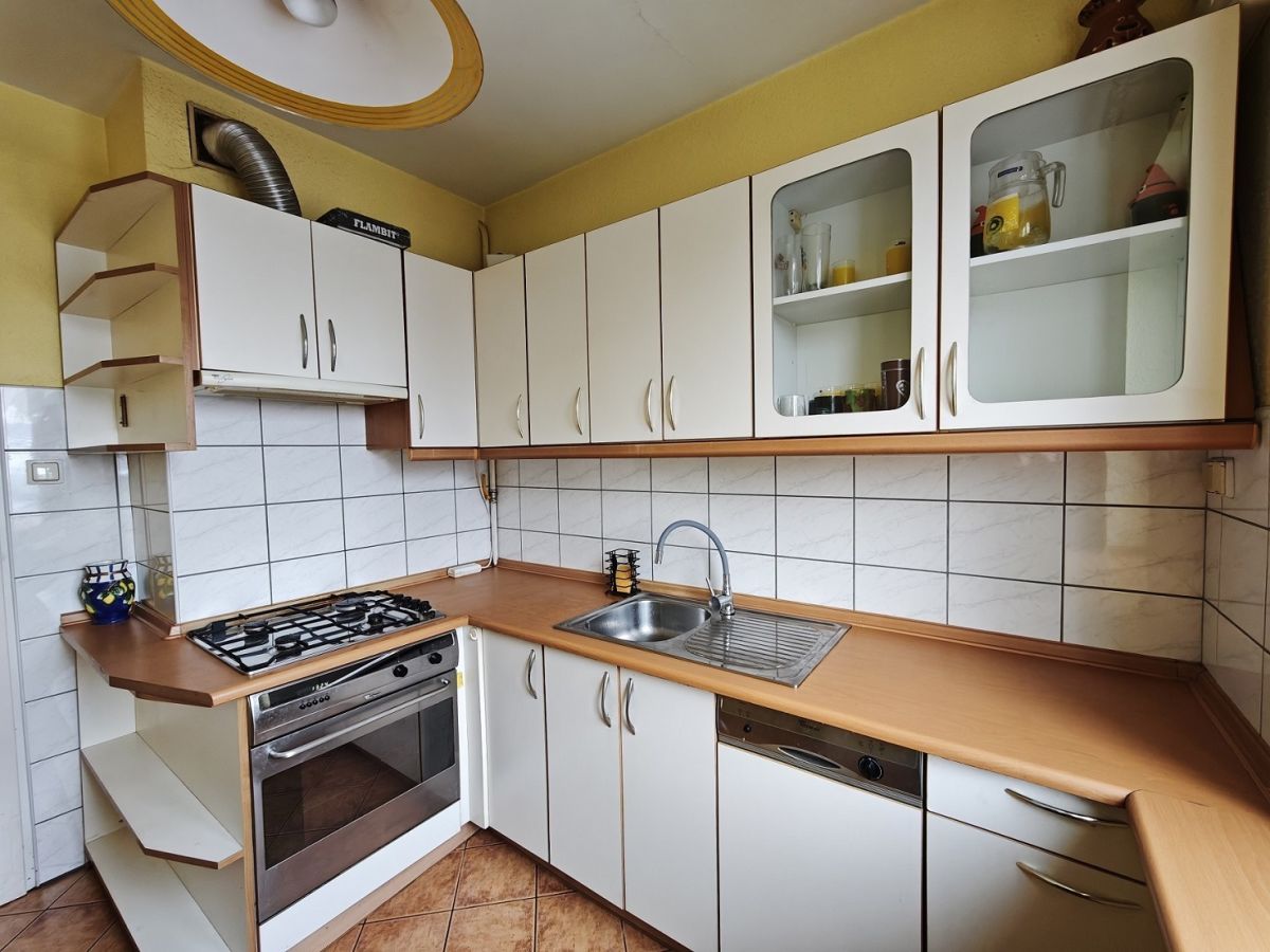 - Jasna, funkcjonalna kuchnia o powierzchni 6,6 m², wyposażona w meble na wymiar, szafki w zabudowie oraz niezbędny sprzęt AGD: piec gazowy, piekarnik, zmywarka, pochłaniacz i lodówka